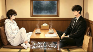 Phòng riêng trên tầng hai là kiểu tatami ngăn cách, hai người chỉ có thể ngồi xếp bằng đối diện nhau, giữa là chiếc bàn gỗ thấp phủ lớp sơn bóng. Qua khung cửa sổ hé mở bên cạnh, có thể nghe rõ tiếng mưa dồn dập nện lên bệ cửa, âm thanh trầm nặng mà dày đặc.